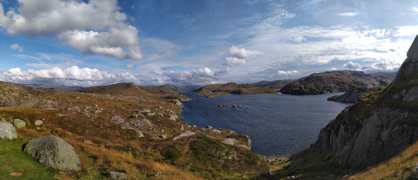 Poco dopo la cittadina di Sauda la strada inizia a stringersi e a salire tra le montagne, regalandoci dei bellissimi panorami tra le cime e i laghetti che circondano la strada. Fortunatamente non troviamo quasi nessuno lungo tutto questo tratto di strada, e procediamo con un andatura più che turistica godendoci la sensazione di calma e di pace che il paesaggio ci trasmette, fermandoci ogni volta che vogliamo per fare foto.