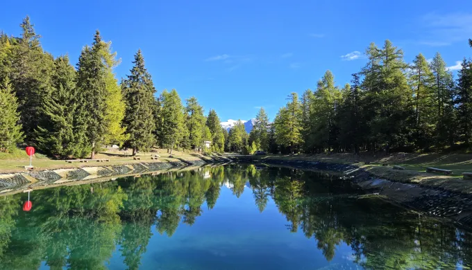 Dopo una salita abbordabile trovo un bivio dove a un albero è affisso il cartello “Nordic walking Park Torgnon” e tutti i sentieri disponibili. Da qui scopro che il sentiero che mi porterà alle paludi è il numero 3 (anche se a volte ho seguito i cartelli gialli contrassegnati dal numero 1 ma indicanti le paludi). Mi fido delle indicazioni e dal parcheggio in circa un’ora e mezza arrivo alle paludi (che in realtà non sono altro che: un laghetto il cui centro è decisamente profondo, un ponte che lo attraversa e tutt’intorno piante a fior d’acqua).
