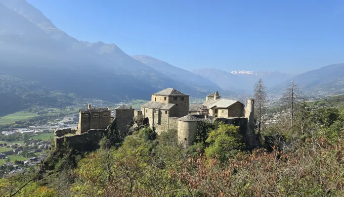 Mi siedo sulla panchina accanto all'eremo (che tra l'altro è chiuso) e mangio qualcosa. Poi riparto, ma invece di tornare subito indietro raggiungo, a pochi passi dall’eremo, un bivio la cui strada in salita è contrassegnata da un cartello che riporta “Saint Grat”. Incuriosito, decido di andare a vedere. Pochi minuti e arrivo a ciò che ha tutta l’aria di essere una stalla con un'abitazione accanto. Nulla di che, ma almeno da qui si scorge un bel panorama della valle e dell'eremo.