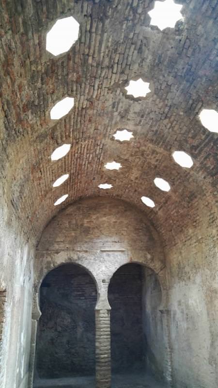 Alla fine di un piccolo corridoio (Zaguán), vi è un cortile con una piscina (alberca) e da qui si può accedere ai bagni stessi, con le tre stanze: camera fredda, (sala de refresco), sala centrale (sala centrale) e, infine, la camera calda (sala caliente). Le colonne sono state prese da rovine romane e visigote ed i fori ottagonali o a forma di stella nelle volte, come già detto prima, permettevano alla luce di entrare e al vapore di uscire. Hanno anche ridotto il peso del tetto.