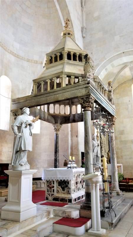 In origine era il mausoleo dell' imperatore Diocleziano. Nella metà del VII secolo il mausoleo dell'imperatore, persecutore dei cristiani, divenne cattedrale nella quale i posti d'onore furono riservati agli altari con le reliquie di San Doimo e Sant'Anastasio, martiri giustiziati nella vicina Salona. La struttura è considerata la più antica cattedrale cattolica al mondo che non ha avuto sostanziali trasformazioni nel tempo a parte la costruzione del campanile romanico (XIII-XIV sec.) alto 57 mt. e l' aggiunta del coro ligneo duecentesco. Nella sacrestia, ora museo della cattedrale, sono conservate molte ed importanti opere d' arte come, oggetti liturgici in oro e argento, antichi manoscritti, icone medievali e paramenti sacri. Visitiamo anche la cripta. Una volta entrati nello stretto cunicolo, ci ritroviamo all'interno dove vi sono vari spazi e delle grosse pietre ammassate con un pozzo centrale e proseguendo troviamo la statua di Santa Lucia. La cripta è dedicata proprio a Santa Lucia di Syracuse protettrice dei ciechi.