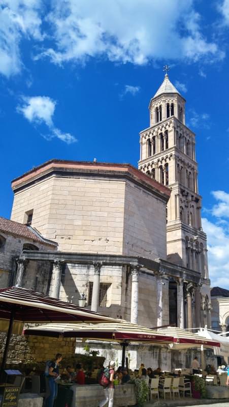 Torniamo nel peristilio che è un brulicare di persone e di "Centurioni" che come al Colosseo a Roma si lasciano fotografare dai turisti. Il campanile della cattedrale (57m) è la più originale costruzione dalmata medievale, iniziata nel XIII secolo. A cavallo tra il XIX ed il XX secolo il campanile fu completamente restaurato e alquanto modificato. Vale la pena salire la scalinata che porta in cima al campanile per godere il bellissimo panorama di tutta la città.