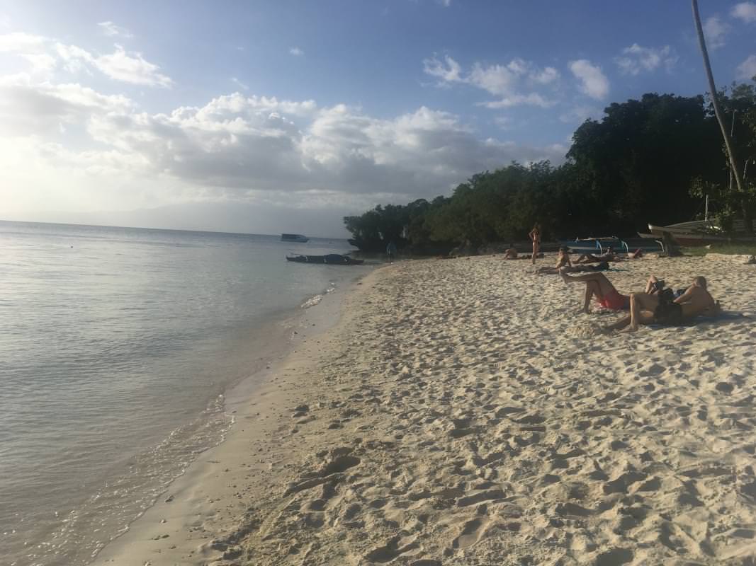 La mia sistemazione, nei pressi di Panagsama beach, è il Bamboo Hut ad 11E a notte, spartano ma non troppo vicino la spiaggia, a stretto contatto con la popolazione locale. Simon, il proprietario australiano del posto, mi aiuta subito ad organizzare la mia spedizione alle Kawasan falls per il giorno dopo, e mi suggerisce di andare a godere subito del reef (e non della spiaggia, come ci tiene a precisare). In effetti la spiaggia è carina ma non molto grande e, di sicuro, meno attrattiva delle altre spiagge che incontrerò in questo viaggio; tuttavia, è praticamente l'ingresso a una barriera corallina magnifica, giusto 3 metri e avrete la sensazione di essere entrati in un grosso acquario!