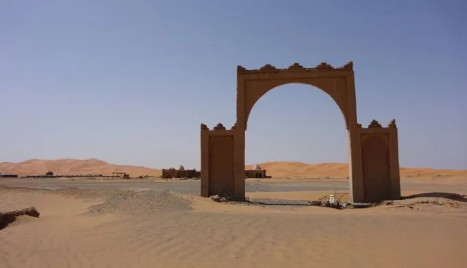 Anche stamattina sveglia presto e dopo una bella colazione servita in hotel ci rimettiamo in marcia direzione sud. Il paesaggio inizia a cambiare e cominciamo ad assaporare una luce che sembra diversa. La prima sosta è alle Sorgenti blu di Meski, raggiungibili con una piccola deviazione dalla strada statale. L'ingresso è a pagamento (intorno ai 2,50 Euro per macchina). Si tratta di una vera e propria oasi con palme rigogliose che lambiscono i canali d'acqua della sorgente. Detta così sembrerebbe un paradiso, ma in realtà l'attrazione turistica è rappresentata da una piscina (piuttosto sporca) con un bar e negozietti di souvenir da cui non uscirete senza accettare almeno un te. Turisti non ne abbiamo visto ma era pieno di locali accampati con ogni sorta di mezzo nei dintorni della piscina affollata. Peccato. Pensavamo di meglio. Ci rimettiamo in macchina diretti a Erfoud. Ben presto il percorso si snoda in panorami davvero unici; dall'alto è possibile ammirare il corso dello Ziz in fondo al canyon contornato da palme e da villaggi berberi ed è così che ci da il benvenuto la regione del Draa-Tafilalet. La strada scende e comincia a seguire il corso del fiume attraverso palmeti da dattero, villaggi, gole e canyon. A Erfoud non ci fermiamo ma è sufficiente il tempo ad attraversarla per scoprire una cittadina caotica e affollata. Proseguiamo ancora per Rissani, dove apprezziamo il bel portale e sfioriamo il suo famoso mercato. Proseguiamo ancora verso la nostra destinazione finale, Merzouga. Da qui il panorama cambia ancora; le auto spariscono, il caldo si fa asfissiante, la lunga fettuccia d'asfalto che corre dritta davanti a noi ci ricorda gli States e finalmente come un vero miraggio le dune arancioni del Sahara appaiono davanti a noi. Siamo entusiasti e raggiunta Merzouga riusciamo ad evitare le orde di beduini che tentano a tutti i costi di piazzare gite ed escursioni a cammello per dirigersi verso la nostra sistemazione, la Kasbah Azalay. E' semplicemente fantastica, proprio ai piedi delle dune, pulita e curata con stanze in perfetto stile berbero e pareti di fango. Sono le 13:30 e dopo esserci ripresi davanti a una ricca insalata beduina cominciano a scoprire qualche piccolo difetto... a quanto pare l'unico generatore elettrico di Merzouga in pieno agosto fa le bizze e l'aria condizionata non fredda l'aria. Un piccolo ventilatore non riesce a spostare l'aria bollente che ci circonda. L'unica salvezza ci è data dalla bella piscina della kasbah dove restiamo fino alle 18:00 per poi prepararci al giro nel deserto col quad fissato per le 18:30. Siamo solo due quad preceduti dalla nostra guida e per due intere ore abbiamo girovagato fra le dune restando letteralmente folgorati dall'immensità del Sahara, dalla bellezza del nulla, dalla maestosità della natura e del silenzio assoluto. Il sole era già scomparso quando la guida ci chiede di affrettarci... il vento si è alzato e nubi all'orizzonte non promettono bene. Siamo quasi alla Kasbah quando siamo colti da una vera tempesta di sabbia e vento. Ceniamo alla Kasbah (5 Euro a persona) gustando una vera cena beduina accompagnata da una buona birra acquistata per noi al market dopo 1000 peripezie. A dire il vero non era buona ma il gusto del proibito l'ha resa eccezionale. Finalmente è ora di riposare un po. E invece no... non è finita così. Avevamo dimenticato il generatore... mai sentito un tale caldo uscire dalle pareti e così abbiamo traslocato a bordo piscina. Ricorderemo sempre con un sorriso la nottata trascorsa su quei lettini investiti dal vento bollente del deserto sotto un cielo meraviglioso.