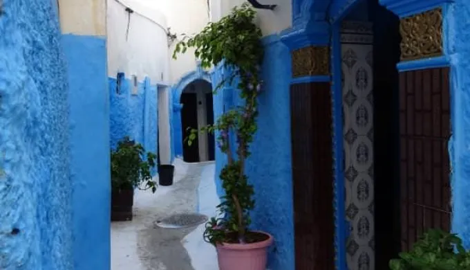 Sono le 05:00 quando veniamo svegliati dalla preghiera proveniente da un Minareto che sembra confinare con la nostra stanza e alle 8:00 siamo già sulla terrazza per una ricca colazione vista mare e panorama sulla Medina e la kasbah. Prima di lasciare l'hotel, andiamo a piedi a visitare la KASBAH DES OUDAIAS, prima attrazione imperdibile della Capitale. Entrando si ha l'idea di essere catapultati in un mondo ovattato e passato, di fare un salto nel tempo. A quest'ora è deserta, ad eccezione di qualche anziano a passeggio e dei molti gatti che la popolano. Un dedalo di vicoli pitturati in bianco e blu, dove fanno bella mostra antichi portali. Dalla piazza principale, posta alla fine dei vicoli, si gode un bel panorama sulle immense spiagge di Rabat e della dirimpettaia Salé. Ritorniamo verso l'ingresso percorrendo altri vicoli, rapiti dalla pace del posto e da begli scorci fotografici (e ad essere estremamente sinceri anche dalla puzza non esattamente definita che si respira!)