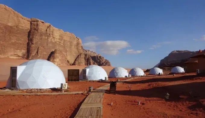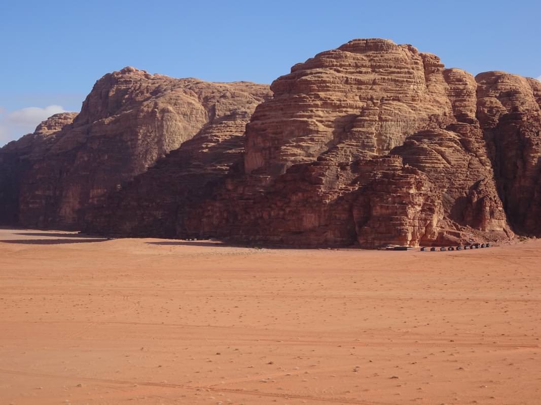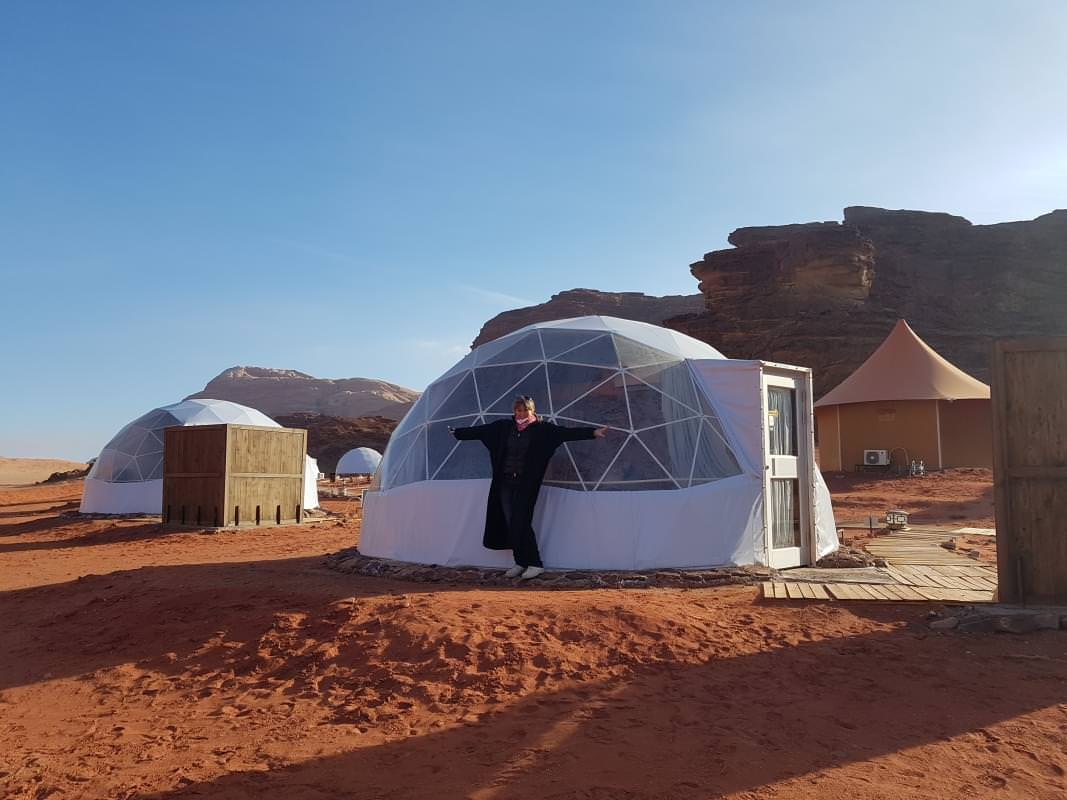 A malincuore volgiamo un'ultimo sguardo al tempio prima di rinfilarci nella gola e salutare Petra con un sicuro arrivederci. Sono circa le 15:00 quando usciamo dal sito e facciamo una sosta veloce per mangiare qualcosa prima di ripartire in direzione Wadi Rum, che vorremmo raggiungere prima del buio. E ci riusciamo. Il sole sta calando quando raggiungiamo il Visitor Center, dopo aver attraversato ancora panorami spettacolari. Qui è sufficiente mostrare che si ha una prenotazione in campo tendato e si può proseguire in auto fino al Wadi Rum village, poche case abitate da beduini. Si conoscono tutti e si avvisano dell'arrivo dei clienti. Non aspettiamo più di 5 minuti prima dell'arrivo della nostra jeep che ci accompagna all'interno dell'area protetta fino al campo. Già da questo primo trasferimento al tramonto siamo innamorati pazzi di questo luogo. Facendo una follia di quelle da "almeno una volta nella vita" abbiamo prenotato una tenda panoramica all'Aicha Luxury Camp e solo scendendo dalla jeep non ci pentiamo della nostra scelta. Il campo è adagiato a ridosso di un costone roccioso in pieno deserto. Il personale, tutti ragazzi giovani, ci accolgo alla jeep ci accompagnano velocemente alla nostra tenda. L'interno è comodissimo e ben arredato con un bel letto e bagno privato. Biancheria pulita. Spettacolare il panorama davanti a noi su cui sta calando la notte. L'unica pecca il freddo... resta pur sempre una tenda e il condizionatore presente non riesce a scaldare opportunamente considerando che all'esterno siamo già a zero gradi! Capiamo subito a cosa servono i due montoni foderati di pelliccia adagiati sul letto al posto degli accappatoi. Ci godiamo l'arrivo della notte nella nostra tenda e poi ce ne andiamo al ristorante. Tutto il camping è un vero colpo d'occhio. Il ristorante, posto in cima proprio sotto le rocce è un angolo di vero lusso in pieno deserto. Il buffet ha una buona scelta e discreta qualità. Bellissimo il bar ricavato sotto la roccia dove gustare un te e fumare la shisha. Questo sogno per una notte costa circa 230,00 Euro... che commisurati ai servizi e alla tenda stessa sono obiettivamente troppi... ma addormentarsi sotto un cielo così stellato da noi ormai inesistente e svegliarsi alle prime luci dell'alba ammirando gli sconfinati spazi di questo spettacolo della natura la rende un'esperienza così bella, unica e magica da giustificare in fondo qualunque prezzo.